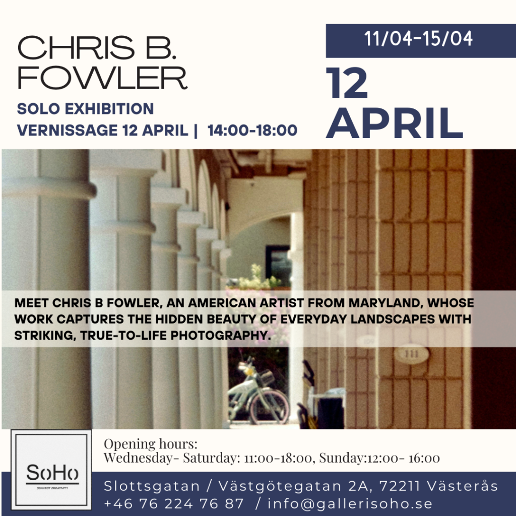 Meet Christopher B Fowler at Galleri SoHo , an American photographer from Maryland, whose work captures the hidden beauty of everyday landscapes with striking, true-to-life photography. Fowler’s work emphasizes truth, form, and the unseen radiance of subjects, inspired by Dylan Thomas, Georgia O’Keeffe, and Joseph Campbell. He avoids Photoshop and heavy manipulation, using only basic cropping and horizontal adjustments. He favors wide-angle lenses for depth of focus, capturing images exactly as seen through the lens, aiming for work that is simple but emotionally resonant. Christopher at the gallery on Saturday the 12th of April from 15:00 .